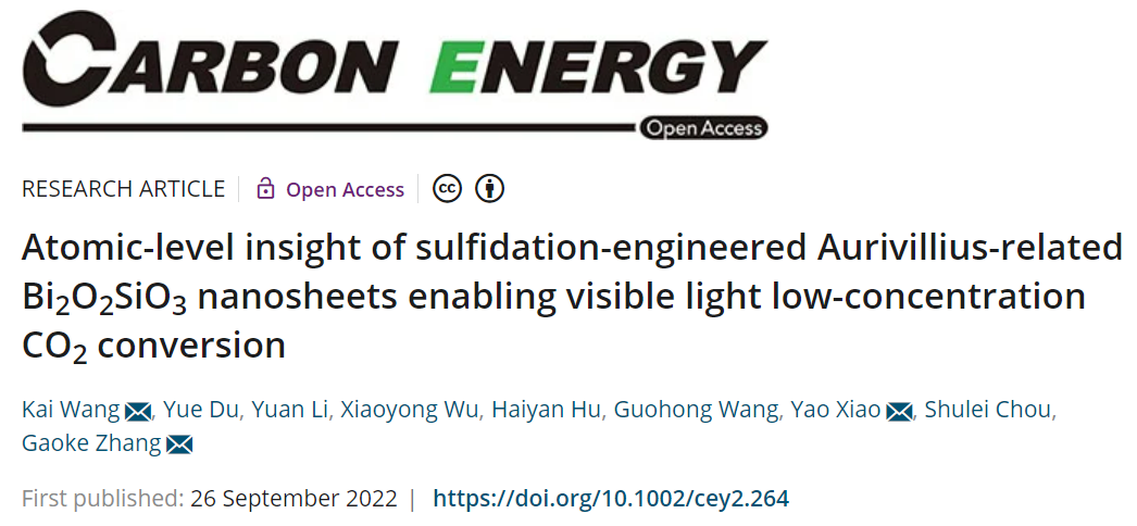 该成果以“Atomic-level insight of sulfidation-engineered Aurivillius-related Bi2O2SiO3 nanosheets enabling visible light low-concentration CO2 conversion”为题发表在高水平期刊Carbon Energy(IF: 21.556)。湖北师范大学王楷副教授为第一作者,公司肖遥瓯江特聘教授与武汉理工大学张高科教授为该论文共同通讯作者。
