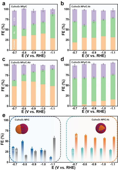 鉴于此,公司王娟副教授成功制备了相和结构可控的Cu/In2O3纳米颗粒(Cu/In2O3 NPS)并将其作为CO2RR电催化剂。其中Cu/In2O3 NPS-H2在较宽电位范围内的CO/H2比值保持恒定且总的FE始终维持在90%以上。
