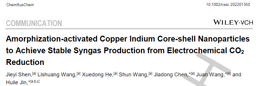 相关论文以“Amorphization-activated Copper Indium Core-shell Nanoparticles to Achieve Stable Syngas Production from Electrochemical CO2 Reduction”为题发表在ChensusChem上(JCR 1区,Top,IF=9.14)。云顶7610线路检测为第一通讯单位,公司本科生沈杰怡为第一作者,公司金辉乐教授、王娟副教授和陈佳东博士后为通讯作者,相关工作受到国家自然科学基金项目的资助。