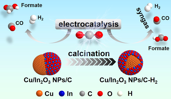 基于上述结果,提出了一种可能的机理:CO2分子吸附在Cu/In2O3 NPs/C表面时会与H+结合形成OCHO*中间体,然后以甲酸的形式解吸附。剩余的中间体将继续与H+偶联生成水,同时释放CO。然而,当异质结的Cu/In2O3 NPs/C转变为非晶态In2O3包覆的Cu核壳结构(Cu/In2O3 NPs/C-H2)后,电催化剂将由甲酸选择性转变为CO选择性。