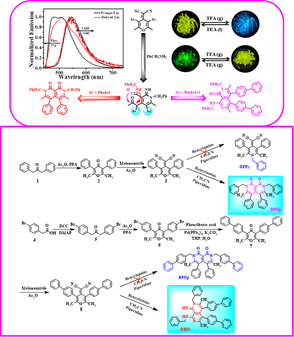 2,7-萘啶衍生物是一类重要的杂环化合物,其具有广泛、优异的生物活性。近年来,它们中的一些也被开发为应用于液态环境中的荧光传感器,但其在延迟发光和固态荧光刺激响应性质方面的研究鲜有报道。该课题组与江西师范大学的丁秋平教授合作,从4H-吡喃结构出发,通过2-(3,5-二芳基-4H-吡喃-4-亚基)丙二腈和苄胺的反应意外获得了两种新的2,7-萘啶类衍生物DPNp和DBNt (Scheme 2),研究发现这两种化合物是通过不同的关环方式实现的。这两种具有扭曲分子构象的化合物在77 K时通过激子的系间窜越显示出磷光,而在室温下则通过激子的反系间窜越发射热激活延迟荧光。此外,由于特殊的电子云分布,DPNp和DBNt分别显示出蓝移和红移的固态酸致变色活性。这项工作对于2,7-萘啶类衍生物固态发光材料的开发提供了借鉴意义。此研究工作发表在知名国际刊物Org. Biomol. Chem.上 (Org. Biomol. Chem. 2022, DOI: 10.1039/d2ob01336c)。
