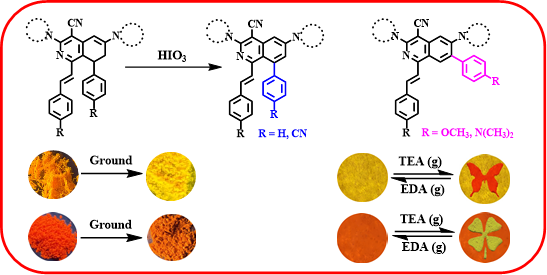 该课题组进一步从4H-吡喃结构出发,通过7,8-二氢异喹啉衍生物在碘酸存在下的脱氢反应,设计并合成了一系列1,7/8-取代异喹啉类化合物(Scheme 3)。研究发现所得脱氢产物与7,8-二氢异喹啉衍生物在1-位和8-位取代基的电子效应密切相关。氢原子和氰基导致所得产物为1,8-二取代异喹啉类化合物,具有强给电子能力的N,N-二甲氨基单元生成1,7-二取代异喹啉类化合物,而具有中等给电子能力的甲氧基则可能同时导致这两类异喹啉化合物的生成。这些结果表明,取代基的强给电子能力有助于重排产物的形成。这些具有扭曲分子构象的1,7/8-取代异喹啉表现出两相发光。尽管所有异喹啉产物在外在压力下都表现出从晶态到无定形态的形貌变化,但只有SQ-MO-7和SQ-DMA-7表现出显著的MFC活性。与其他异喹啉类化合物相比,这两种化合物在结晶状态下具有更平坦的分子构象,这使得它们具有足够的变形空间,能在外在压力下获得更扭曲的构象,从而表现出蓝移的MFC性质。此外,目标化合物均表现出可逆的固态酸致变色活性,这被证明是由质子化-脱质子化过程引起的分子内电荷转移变化导致的。此研究工作发表在知名国际刊物J. Mater. Chem. C上 (J. Mater. Chem. C 2022, 10, 9875–9881)。