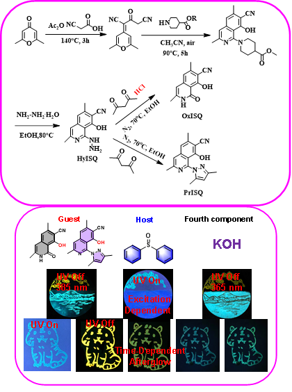 通过利用掺杂系统中的主体可以用作包含其他组分的容器的优点构建多组分室温磷光(RTP)掺杂材料以改善磷光性能是未来的趋势。该课题组从4H-吡喃结构出发,设计合成以两种异喹啉衍生物(OxISQ和PrISQ)为客体、二苯亚砜(SDB)为主体以及碱(KOH)为第四组分构建了多组分掺杂系统(Scheme 4)。双组分掺杂材料OxISQ/SDB具有强的青色RTP,而PrISQ/SDB几乎没有RTP活性。KOH对OxISQ/SDB磷光强度的影响与激发有关。当λex = 365 nm时,KOH减弱体系的磷光发射,表明加入KOH的三组分掺杂材料OxISQ/SDB/KOH的强度明显弱于OxISQ/SDB,而在λex = 385 nm时KOH显示出增强OxISQ/SDB体系磷光的特性。对于PrISQ/SDB而言,KOH则只展现出磷光增强的能力,PrISQ/SDB/KOH发出强烈的黄橙色RTP。进一步,构建了两个客体的四组分掺杂系统OxISQ/PrISQ/SDB/KOH,发现随着KOH的增加,从OxISQ/PrISQ/SDB到OxISQ/PrISQ/SDB/KOH, 体系的磷光颜色在λex = 365 nm时逐渐从青色变为绿色、黄色以及橙色,但在λex = 385 nm时则只能直接从青色转变为黄色。由于每个组分的磷光寿命、强度和波长不同,OxISQ/PrISQ/SDB/KOH在2秒内呈现出从橙黄色到青色的时间依赖性余辉颜色变化。实验结果证实,含酚结构的客体与KOH反应形成有机盐,从而在掺杂材料中诱导新的激发波长和发射波长。这项工作是首次构建具有可以进行化学反应的双客体四组分掺杂RTP体系。此外,利用KOH的水溶性,掺杂材料可在水相中实现先进的防伪书写和打印。此研究工作发表在知名国际刊物ACS Materials Lett.上 (ACS Materials Lett. 2022, 4, 1764−1773)。