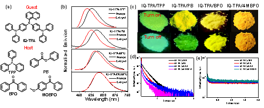 调节激子的T1-S1和T1-S0过程,结合热激活延迟荧光(TADF)和RTP发射以实现有机材料中余辉现象的多样化依然是一个有挑战的任务。该课题组设计选择以包含有喹啉和三苯胺单元的有机分子IQ-TPA作为客体分子,以四个具有不同能级的主体分子,如三苯基膦、苯甲酸甲酯、二苯甲酮和(4-甲氧基苯基)(苯基)甲酮为主体分子构建主体-客体掺杂体系以实现这种可能(Scheme 7)。研究发现主体分子能有效地提高客体激子的系间窜越(ISC)/反向系间窜越(RISC)效率,导致掺杂材料几乎只具有RTP和TADF发射,而没有瞬态荧光发射。重要的是,不同能级的主体分子可以进一步调节掺杂体系TADF和RTP中激子的比例,使两种发光组合成一个具有较宽范围(498 nm-571 nm)的新的延迟发光,掺杂材料的余辉颜色从TADF的青色逐渐红移到RTP的橙黄色。此外,由于TADF的寿命大于RTP,掺杂材料出现稳态发光波长大于延迟波长的异常现象,即在紫外的照射下(Turn On)的颜色比撤去紫外灯(Turn Off)的颜色更红。这项工作对于研究掺杂材料的发光机理和扩展掺杂材料的余辉发光现象具有重要意义。此研究工作发表在知名国际刊物J. Mater. Chem. C上 (J. Mater. Chem. C 2022, 10, 11607–11613)。