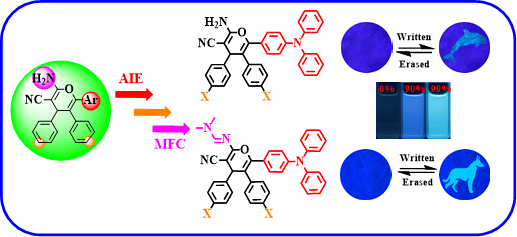 虽然具有扭曲结构的聚集诱导发光(AIE)活性分子已成为压致荧光变色(MFC)材料的主流,但扭曲的分子构象并不一定导致MFC活性。最近,一些基于4,5,6-三芳基-4H-吡喃骨架构建的具有扭曲构象的分子即被发现不具备MFC性质。基于此,该课题组从简单的4H-吡喃结构出发,设计并合成了一系列新的4,5,6-三芳基-4H-吡喃衍生物,以获得同时具有AIE和MFC活性的荧光材料(Scheme 1)。研究结果表明,三苯胺的引入赋予所有这些螺旋桨型化合物典型的AIE性质,这被证明是源于分子内旋转受阻的机制;而卤素原子的引入和氨基的亚胺化则被发现均有助于通过降低衍生物的结晶能力而产生MFC活性。并且,红移的MFC现象被证明应归因于在外部压力下,荧光分子由晶态到无定形态转变所引起的分子构象的平面化。这项工作证实了适当的结晶能力对于AIE活性分子表现出MFC活性非常重要,而荧光分子所具有的适当的结晶能力可以通过精确的结构修饰得以实现。此研究工作发表在知名国际刊物Dyes Pigm.上 (Dyes Pigm. 2022, 207, 110788)。