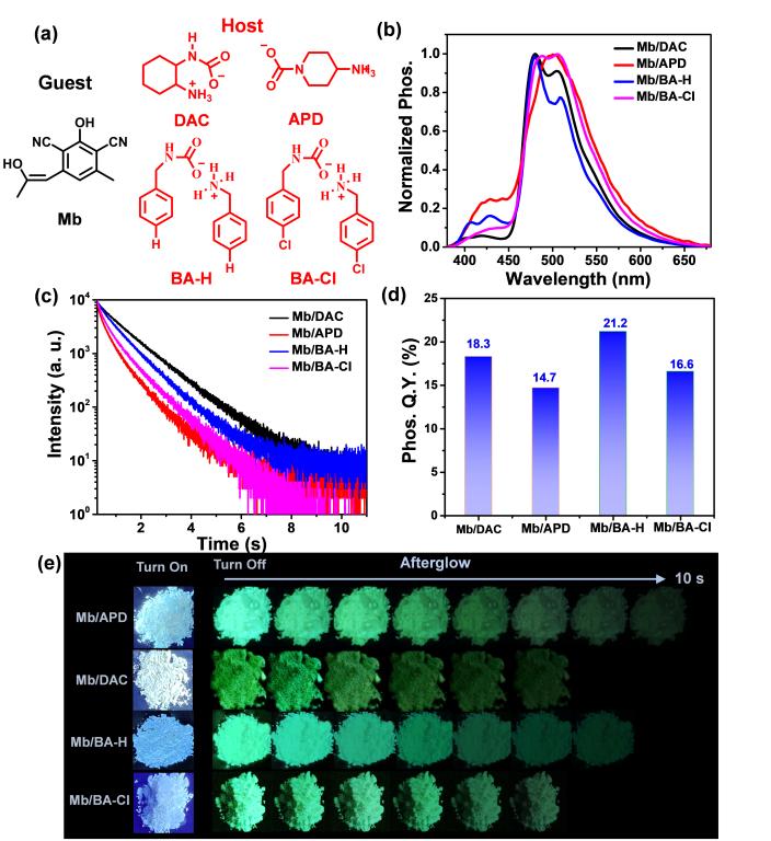 在大多数主客体有机室温磷光掺杂材料中,尽管研究者们已经发现其磷光主要是源于客体分子的激子历经系间窜越 (ISC),并最终发出磷光,但主体基质除了提供刚性环境外所起的作用仍然存在争议。并且在掺杂体系中,大多数主体基质是中性有机物,带电有机盐很少用作基质,但事实上,带电的有机盐应该更容易与有机化合物的激子相互作用,这不仅有利于产生特殊或意外的磷光性质,而且有助于探索掺杂系统中主体基质的作用。该课题组设计以四种新型季铵盐(DAC, APD, BA-H, BA-Cl)主体,以从4H-吡喃结构出发合成得到的2-羟基-4-(2-羟基-1-丙烯基)-6-甲基-1,3-苯二腈 (Mb)为客体构建了一种新的掺杂体系(Scheme 5)。此掺杂材料在移除激发光源后,显示出强烈的绿松石色余辉,余辉时间长达7-10秒,其磷光寿命为581-1091 ms,磷光效率为14.2-21.2%。有趣的是,与常见的有机室温磷光掺杂系统不同,在此掺杂体系中,尽管激发源的能量仍然由客体分子吸收,但掺杂系统的磷光最终由主体而不是客体发出,即客体分子首先吸收能量,然后客体的单重态激子转移到主体的三重态;因为主体携带的电荷能有效稳定三重态激子,使得主体的三重态激子可以直接回到基态以产生室温磷光。这项工作对于拓展和丰富RTP掺杂材料的发光特性和发光机理具有重要的参考意义。此研究工作发表在知名国际刊物Chem. Commun.上(Chem. Commun. 2022, DOI: 10.1039/d2cc04521d),并被Chem. Commun.选为2022年度的HOT Articles之一。