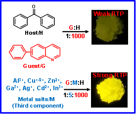 多组分掺杂体系的构建是室温磷光材料发展的一个重要方向。该课题组与北京理工大学的蔡政旭教授合作,选择二苯甲酮作为主体,设计各种苯基取代的喹啉异构体作为客体,选择七种金属离子作为第三组分(分别为Al3+、Cu+/2+、Zn2+、Ga3+、Ag+、Cd2+和In3+),构建了一系列三组分掺杂RTP体系(Scheme 6)。金属离子可以通过与客体的氮原子配位来影响客体的电子性质,最终改善掺杂材料的磷光性质。研究发现Ag+和Cd2+可以显著提高掺杂体系的磷光发射强度达38倍,掺杂体系的最高磷光量子效率达到70%。Al3+、Ga3+和In3+可以延长掺杂体系的磷光发射波长,其磷光波长可以红移60 nm。Cu2+、Ga3+和In3+可以将磷光寿命延长最多3.6倍。一系列实验表明,金属和客体的配位是提高磷光性能的关键。这项工作创造了一种简单有效的策略来增强掺杂材料的磷光性能。此研究工作发表在知名国际刊物J. Phys. Chem. Lett.上 (J. Phys. Chem. Lett. 2022, 13, 7607−7617)。