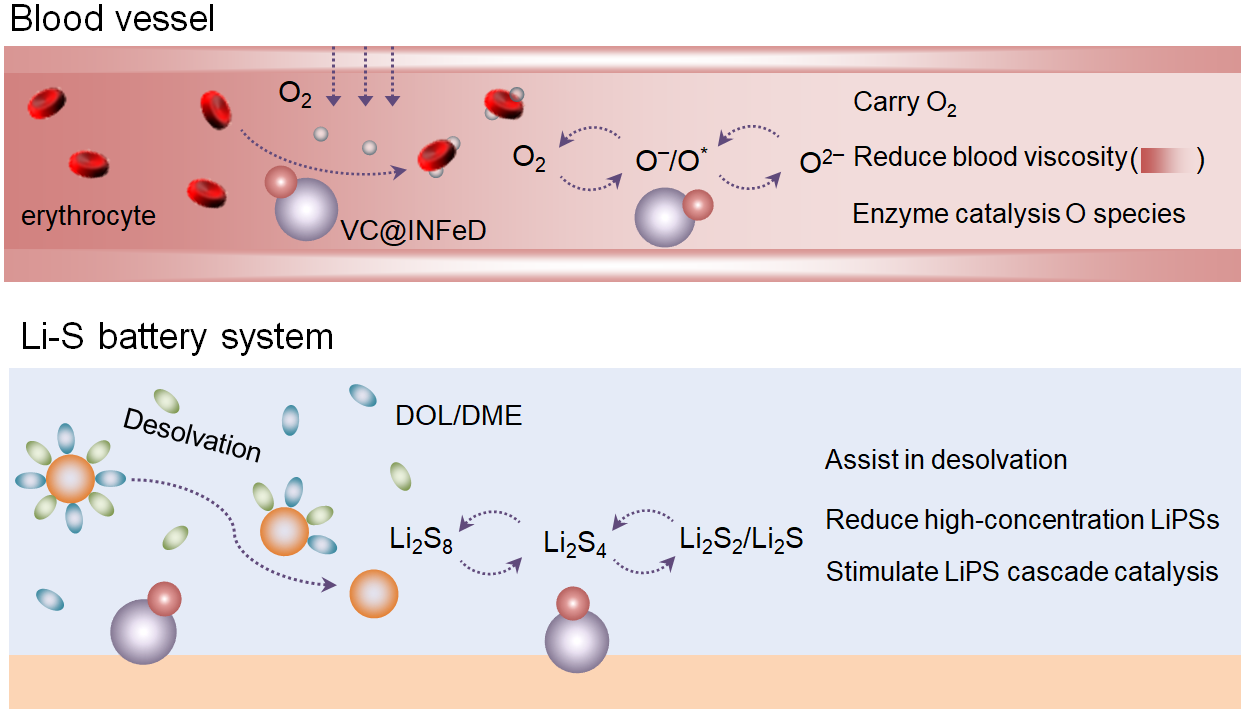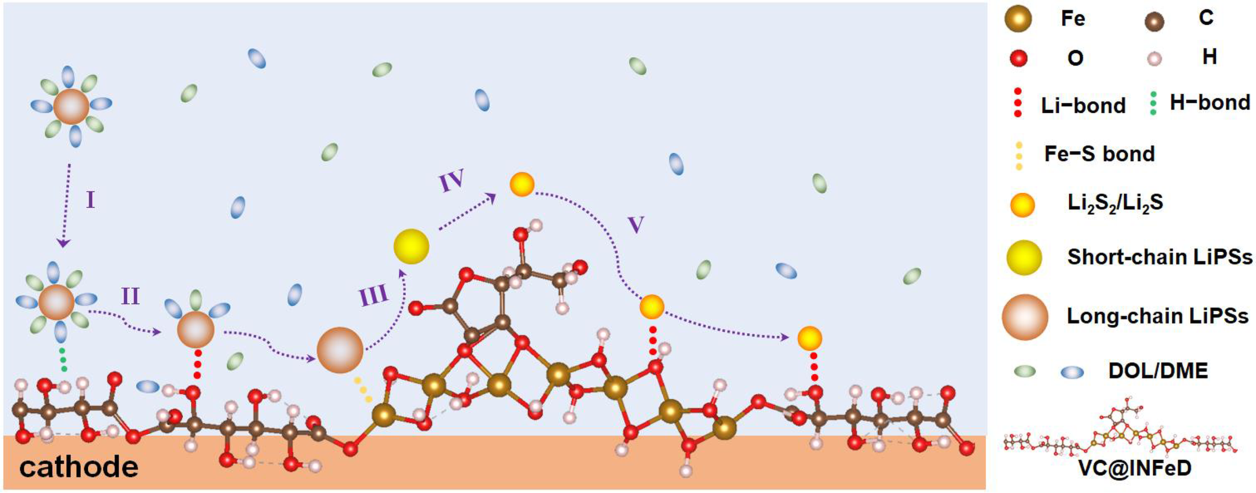 在此,受右旋糖酐铁(INFeD)和抗坏血酸(VC)联合作为治疗贫血的补血药启发,公司杨植教授、蔡冬博士联合杨硕博士开发了一种高效的VC@INFeD硫正极催化剂,在多重H/Li键的协助下,溶剂化的多硫化锂(LiPSs)在正极/电解质界面上可通过具有梯度吸附能力的羟基基团完成富集和脱溶化,随后在INFeD链上完成转移,进而在VC@INFeD级联催化位点实现其彻底转化。结果表明,INFeD主要促进长链LiPSs的转化,VC加速短链LiPSs的转化,两者协同可以显著降低每个硫氧化还原步骤的能量势垒,并赋予锂硫电池优异的电化学性能。即使在高硫含量(5.2 mg cm‒1)和贫电解质(E/S,~7μL mg−1)条件下,也具有高硫利用率和良好的循环稳定性。