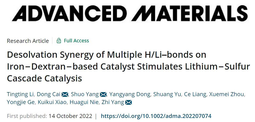 因此,本研究以 “Desolvation Synergy of Multiple H/Li–bonds on Iron−Dextran−based Catalyst Stimulates Lithium−Sulfur Cascade Catalysis”为题发表在材料领域顶级期刊《Advanced Materials》。云顶7610线路检测作为第一通讯单位,2020级研究生李婷婷为第一作者,公司杨植教授、蔡冬博士和电气与电子工程公司杨硕博士为共同通讯作者,该工作得到国家自然科学基金、浙江省自然科学基金的部分资助。