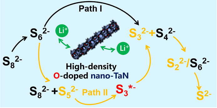 氮化钽(TaN)因其带隙窄、过电位低、化学稳定性高等优点,被广泛应用于氧还原等电催化反应。尽管TaN在锂硫电池中具有很高的催化硫氧化还原反应的潜力,但TaN在锂硫电池中的应用研究尚未见报道。为了解决锂硫电池中的穿梭效应和反应动力学迟缓的问题,公司杨植教授团队开发了一种多孔高密度氧掺杂氮化钽纳米结构(nano-TaNO)作为高效催化剂应用于锂硫电池中。nano-TaNO内部和表面都形成了均匀的纳米孔通道,具有储存更多的硫物种、易于电解液渗透和良好的电子/Li+传输等优点。更重要的是nano-TaNO中高密度O掺杂不仅提供了高导电性,还通过Li−O化学相互作用和激发S3*−自由基的生成促进了多硫化物的吸附/转化,开辟了从S8到Li2S新的转化路径。因此,即使在高硫负载条件下,nano-TaNO正极也表现出优异的比容量和可循环性。该项工作表明,氮化钽和大量阴离子掺杂工程在调控多硫化物中间体的形成和制造高性能锂硫电池方面具有巨大的潜力。