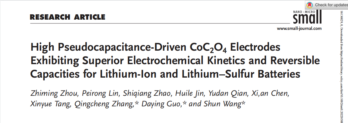 这一研究结果以“High Pseudocapacitance-driven CoC2O4 Electrodes Exhibiting Superior Electrochemical Kinetics and Reversible Capacities for Lithium-ion and Lithium-Sulfur Batteries”为题发表在国际权威期刊《Small》(IF=15.153),云顶7610线路检测作为第一通讯单位,云顶7610线路检测2019级研究生周志明和2020级研究生林培荣为文章的共同第一作者,公司张青程副教授,王舜教授和郭大营博士为本文的共同通讯作者。该工作受到国家自然科学基金项目(21706196和21905208)、浙江省自然科学基金项目(LZ20E010001)和浙江省高水平人才专项支持计划(2019R52042)的支持。