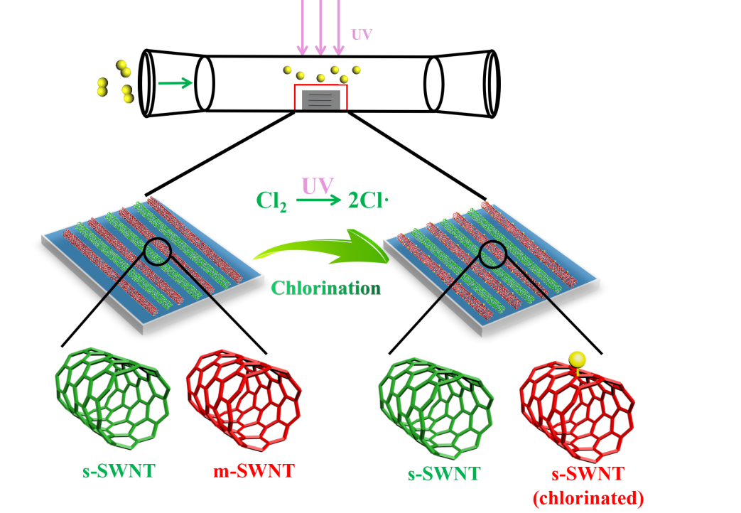 为解决上述问题,云顶7610线路检测胡悦特聘教授团队联合广东工业大学黄少铭教授与吉林大学赵秋辰教授,提出了一种光氯化法制备半导体单壁材料碳纳米管及其分子内结。如图1所示,氯气在紫外线照射下分解得到氯自由基,可选择性地与金属性单壁碳纳米管共价结合,打开其带隙使其转变为半导体性单壁碳纳米管,最终使得整个单壁碳纳米管水平阵列呈现半导体性并在室温条件下可长期保持稳定性。