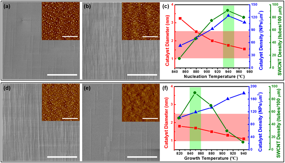 图4. 催化剂成核温度和SWNT生长温度对催化剂直径、催化剂密度和SWNT密度的影响。(a,b)在850°C成核温度(a)和940°C (b)生长温度(850°C)下生长的SWNTs阵列的SEM图(插图:催化剂颗粒的AFM图)。(c)不同成核温度下催化剂平均直径(方形)、催化剂密度(三角形)和SWNT密度(圆形)的统计。(d,e)在生长温度为850°C (d)和940°C (e)、成核温度为940°C下生长的SWNT阵列的SEM图像(插图:催化剂颗粒的AFM图像)。(f)不同生长温度下催化剂的平均直径(四方角)、催化剂密度(三角形)和SWNT密度(圆形)的统计。(红色阴影区域表示SWNT生长的合适直径范围) (比例尺,a、b、d、e为40 μm,插图内为1 μm)