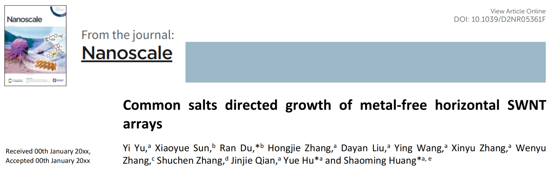 这一成果近期以“Common salts directed growth of metal-free horizontal SWNT arrays”为题发表在国际期刊《Nanoscale》上,云顶7610线路检测为第一通讯单位,云顶7610线路检测云顶7610线路检测研究生余艺为文章的第一作者,公司胡悦特聘教授、北京理工大学杜然教授、广东工业大学黄少铭教授为通讯作者。