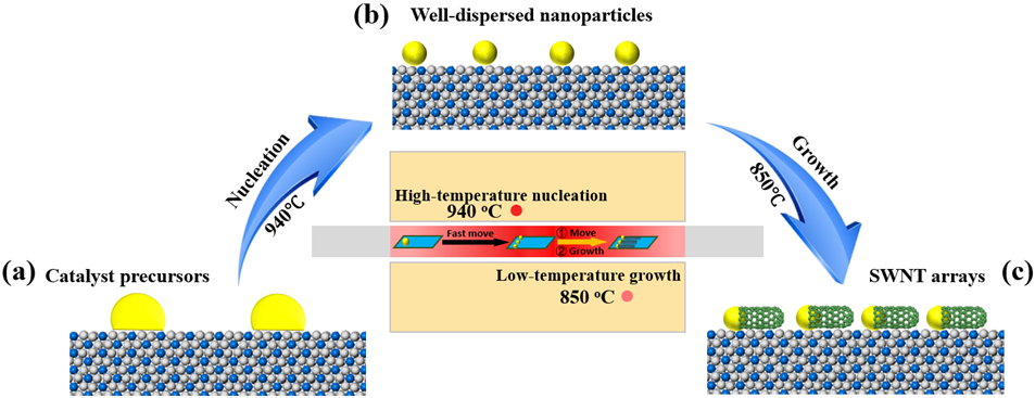 图1. 通过快速成核方法形成和沉积催化剂纳米颗粒和在石英衬底上生长水平SWNTs阵列的示意图。