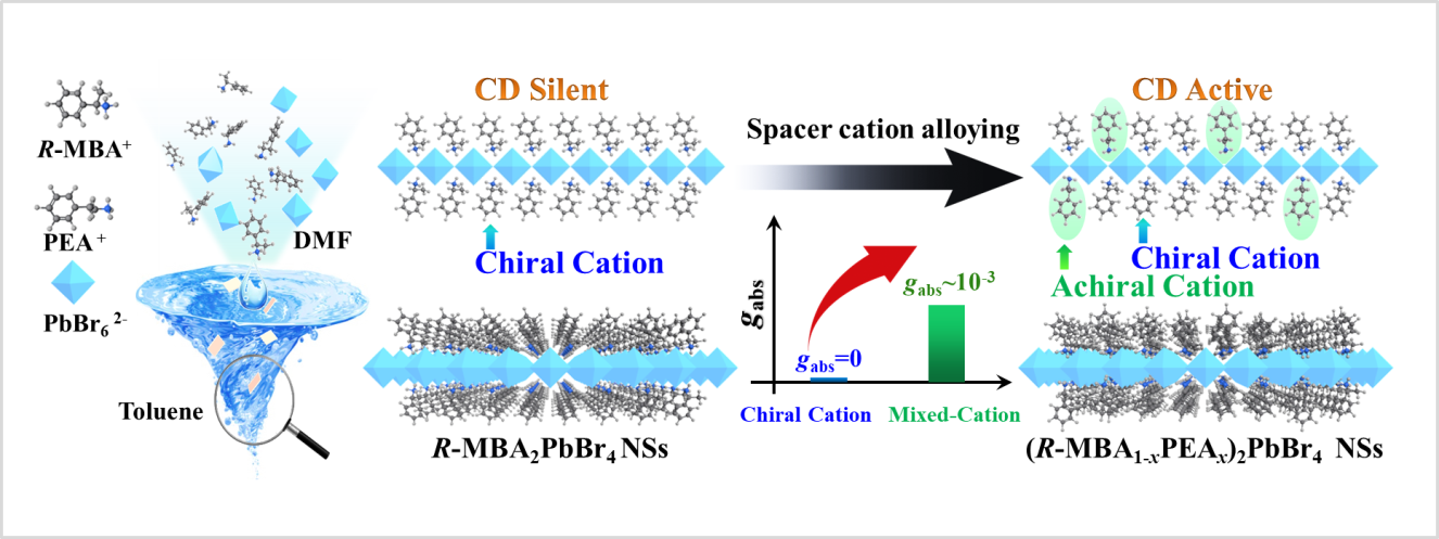 1. 针对二维手性钙钛矿纳米材料因大多数手性铵阳离子较大位阻导致圆二色响应差、商业化手性铵阳离子选择少等问题,首次采用混合阳离子策略提高了二维手性钙钛矿纳米片((R-MBAxPEA1-x)2PbBr4 NSs)的手性性质(各向异性因子gabs最高值达3.8×10-3),并有效拓展了手性铵阳离子的选择性,同时阐明手性铵阳离子结构与钙钛矿手性活性间构效关系。