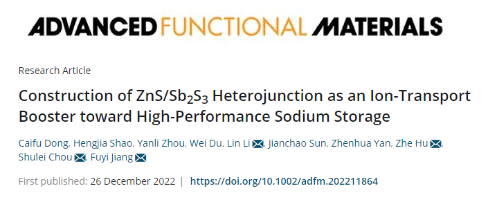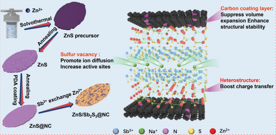 金属硫化物具有优异的氧化还原可逆性和较高的容量,在SIBs领域中具有广阔的应用前景。近日,公司碳中和技术创新研究院李林团队联合烟台大学和深圳大学在国际权威期刊Advanced Functional Materials上发表题为《Construction of ZnS/Sb2S3 Heterojunction as an Ion-Transport Booster toward High-Performance Sodium Storage》的学术论文。该工作通过阳离子交换法将Sb2S3引入ZnS中,合成了氮掺杂碳包覆的ZnS/Sb2S3 (ZnS/Sb2S3@NC)异质结结构。理论计算和实验研究表明ZnS/Sb2S3@NC异质结结构的构建有效的提升了电荷转移速率。因此,ZnS/Sb2S3@NC表现出优异的循环稳定性(循环450圈后可逆容量为511.4 mAh g-1)和倍率性能(在10 A g-1电流密度下的可逆容量为400.4 mAh g-1)。此外,通过X射线衍射和高分辨率透射电镜深入研究了ZnS/Sb2S3@NC的储钠机理。最后,组装了ZnS/Sb2S3@NC//Na3V2(PO4)3/ rGO全电池,其在循环50圈后仍具有226.2 mAh g−1的可逆容量。相关文章发表在Advanced Functional Materials上,公司侴术雷教授、李林特聘教授为该论文共同通讯作者,相关工作受到国家自然科学基金、浙江省自然科学基金、山东省自然科学基金和国家电网公司科技项目的资助。