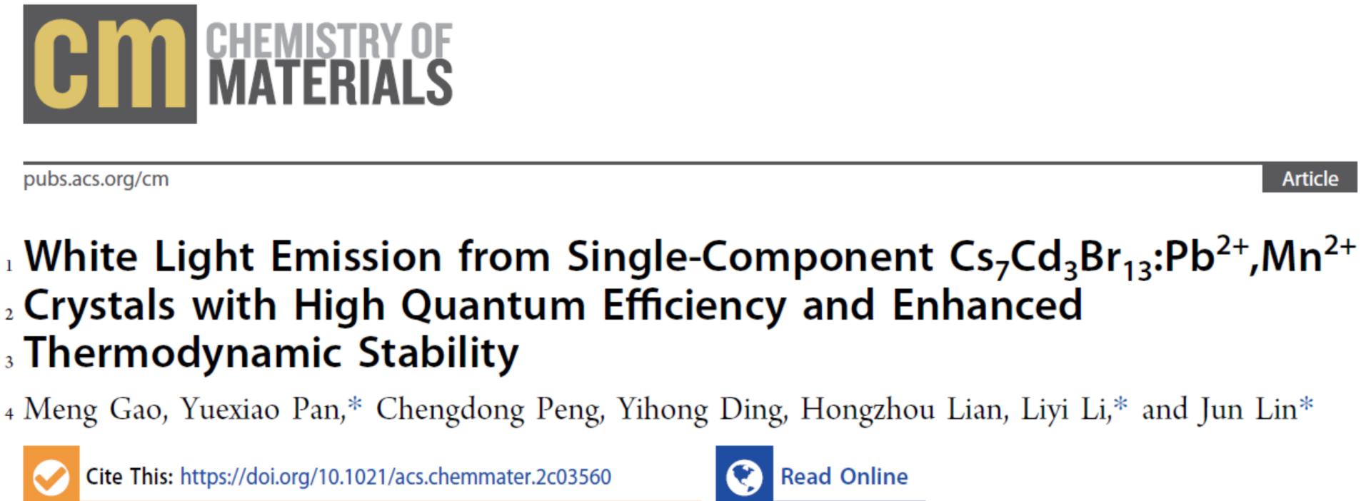 近日,云顶7610线路检测潘跃晓课题组在国际著名刊物《Chemistry of Materials》上发表题为“White Light Emission from Single-component Cs7Cd3Br13:Pb2+,Mn2+ Crystals with High Quantum Efficiency and Enhanced Thermodynamic Stability”的论文,提出一种Pb2+/Mn2+共掺杂策略,在双格位晶体Cs7Cd3Br13中实现量子产率(PLQY)高达98%的双带可调谐白光发射。通过变温光谱、寿命衰减曲线等手段提供可靠证据证明其发光源自基质的STE1、Pb2+离子诱导的自由激子(FE)和STE2、Mn2+离子d-d跃迁的发射。通过理论计算与实验结果证实了Pb2+和Mn2+在双格位晶体Cs7Cd3Br13中优先占据孤立的[CdBr4]2-四面体而不是[CdBr6]4-八面体。这一发现为在单组分中产生多个发光中心获得单组分白光提供了一个新的视角,有助于阐明同一晶体中,掺杂剂在不结构单元的优先占位机制。
