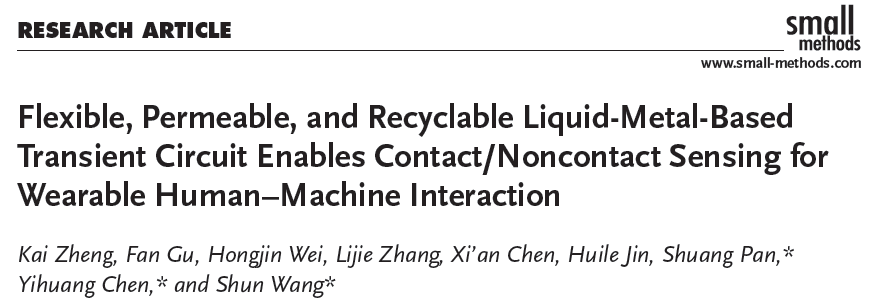 相关研究以“Flexible, permeable and recyclable liquid-metal-based transient circuit enables contact/non-contact sensing for wearable human-machine interaction”为题发表在国际期刊《Small Methods》(IF=15.367)上,云顶7610线路检测作为唯一通讯单位,公司2020级硕士研究生郑凯为第一作者,公司陈亦皇教授、潘霜副教授、王舜教授为本文通讯作者。该工作得到张礼杰、陈锡安、金辉乐等老师的协助,并受到国家自然科学基金(No.62104170和22109120)、浙江省自然科学基金(LQ21B030002和LY23F04000)与浙江省高层次人才专项支持计划(2019R52042)等项目的支持。