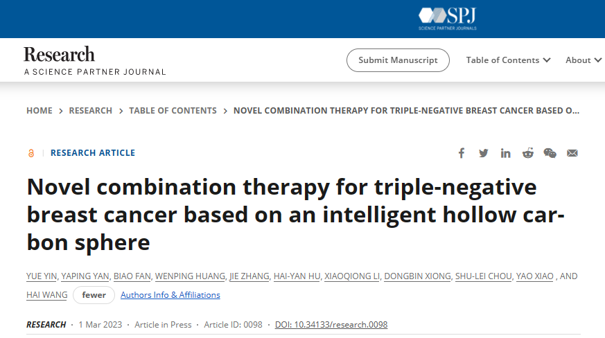 该成果以“Novel combination therapy for triple-negative breast cancer based on an intelligent hollow carbon sphere”为题发表在国际权威期刊《Research》上,IF:11.036,中科院期刊分区表1区。公司肖遥特聘教授与国家纳米科学中心王海研究员为该论文共同通讯作者。感谢国家自然科学基金委、浙江省自然科学基金委、温州市科技局项目、教育部产学合作项目、云顶7610线路检测启动基金、西安交通大学开放基金、与南开大学开放基金的大力支持