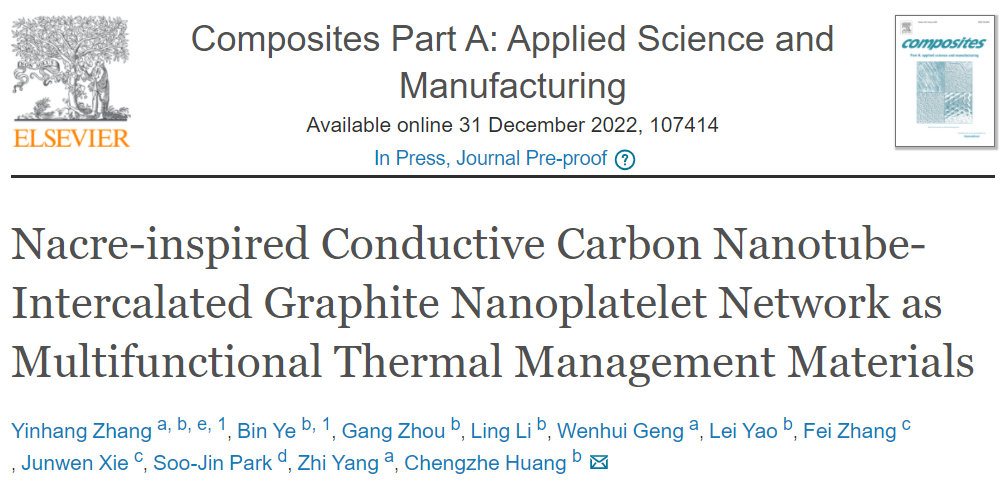 这一研究成果以“Nacre-inspired Conductive Carbon Nanotube-Intercalated Graphite Nanoplatelet Network as Multifunctional Thermal Management Materials”为题发表在复合材料一区TOP国际期刊《Composites Part A: Applied Science and Manufacturing》,云顶7610线路检测作为第一通讯单位,公司张银行博士和本科生叶斌为共同第一作者,公司杨植教授、黄承哲教授为本文共同通讯作者。