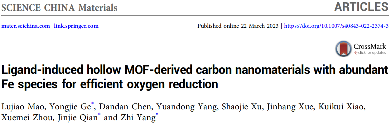 参考文献:Mao, L., Ge, Y., Chen, D., Yang, Y., Xu, S., Xue, J., Xiao, K., Zhou, X., Qian, J., and Yang, Z. Ligand-induced hollow MOF-derived carbon nanomaterials with abundant Fe species for efficient oxygen reduction. Sci. China Mater. 2023, 10.1007/s40843-022-2374-3.
