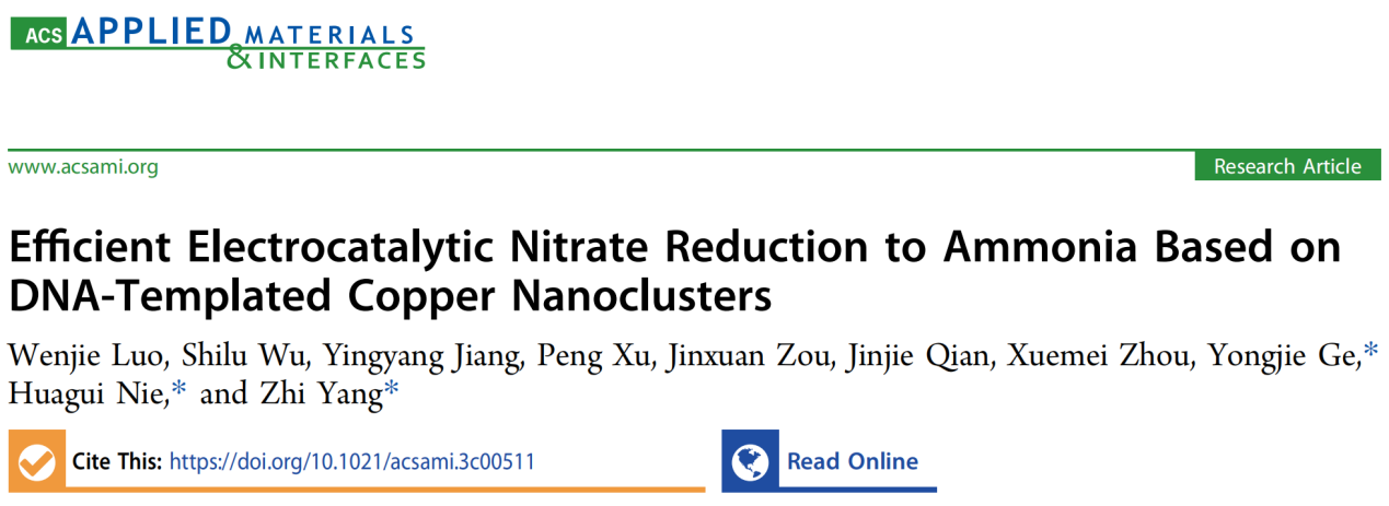 相关研究成果以《Efficient Electrocatalytic Nitrate Reduction to Ammonia Based on DNA-Templated Copper Nanoclusters》为题发表在国际著名期刊《ACS Applied Materials& Interfaces》(IF:10.383)上,云顶7610线路检测为第一单位,我院2020级研究生罗文杰为第一作者,公司杨植教授、聂华贵教授、葛勇杰博士为共同通讯作者。公司钱金杰副教授,周学梅博士,研究生吴世路,江颖洋,许鹏,邹锦萱参与了该项工作。上述工作得到了国家自然科学基金的支持。