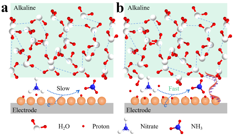 铜基催化剂表现出储量丰富、易得和价廉等优点,且Cu的d轨道和硝酸盐的LUMO π*分子轨道之间能级的匹配度高,使得Cu基催化剂有望促进NO3RR的热力学和动力学过程。理论和实验研究证明酸性条件下铜基催化剂催化的NO3RR在热力学和动力学上优于碱性条件,其原因是由于碱性环境中由于缺乏质子导致NO3RR的加氢步骤动力学缓慢。然而,由于酸性条件下过度的析氢反应会抑制NO3RR过程。因此NO3RR通常是在碱性环境中进行的。针对在碱性溶液中由于缺乏质子而导致的Cu基催化剂催化NO3RR氢化步骤动力学缓慢的问题,我们用含有40个胸腺嘧啶的单链DNA为模板合成了粒径为1.7 nm的铜纳米簇(标记为T40-CuNCs)用于增强NO3RR过程。T40链中未与CuNCs结合的部分可以延伸到电解液中,通过其极性基团与水分之间形成氢键在电极表面构建了一个连续的氢键网络,进而定向输送水分子至催化剂表面,促进了催化剂表面水电解产生质子的反应活性。催化剂表面充足的质子加速了NO3RR过程的氢化步骤。因此,与传统的Cu催化剂相比,我们设计的T40-CuNCs催化剂具有更强的促进NO3RR反应的催化活性。在−0.6 V vs. RHE时,硝酸盐转化为NH3的法拉第效率(FE)达到96.8%,NH3产率达到2.62 mg·h-1·cm-2。