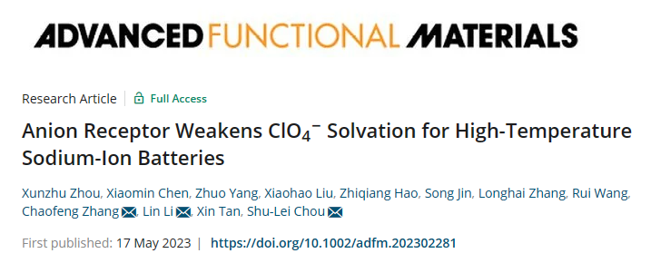 可充电池对季节性和日常工作温度波动的温度耐受性极大影响其稳定性和安全性。然而,高温会加剧电解液的持续性分解,生成不稳定的正极-电解液界面膜(CEI),导致电池容量的快速衰减。近日,公司碳中和技术创新研究院李林团队联合安徽大学在国际权威期刊《Advanced Functional Materials》上发表题为《Anion Receptor Weakens ClO4–Solvation for High-Temperature Sodium-Ion Batteries》的学术论文。该工作引入了阴离子受体三(五氟苯基)硼烷(TPFPB)作为电解液添加剂,通过构建稳固且富含NaF的CEI膜提升电池的高温循环稳定性。密度函数理论(DFT)证明TPFPB和ClO4−阴离子之间通过B-O键表现出强相互作用,体现为两方面优势:其一,高氟化末端的TPFPB添加剂通过ClO4−阴离子参与中心Na+的溶剂化构型配位,并优先分解生成稳固且富含NaF的CEI膜;其二,削弱了ClO4−的溶剂化作用,促进溶剂与Na+阳离子的配位能力,显著提高电解液的氧化稳定性。所构筑的电解液在磷酸钒钠正极中,在4.2V的高截止电压(vs. Na+/Na)和60℃的高温条件下,100次循环后容量保持率达86.9%,并在-30至60°C的宽温域范围内展现出优异的高压稳定性及倍率性能。相关文章发表在国际著名期刊Advanced Functional Materials上,公司侴术雷教授、李林特聘教授为该论文共同通讯作者,相关工作受到国家自然科学基金、安徽省自然科学基金、浙江省自然科学基金、国家电网科技计划等项目的支持。