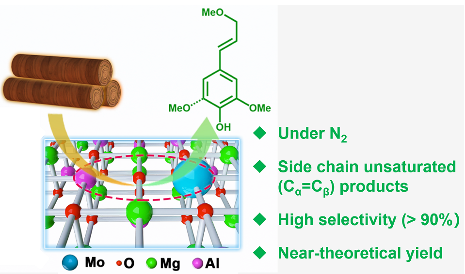 木质素是木质纤维素生物质中含量最高的芳香族聚合物,具有由C-C/C-O键连接的类苯丙基单元,其中芳醚键的比例高达50-85%,因此,通过C-O键裂解进行木质素的解聚引起了人们的较多关注,该方法也为从天然生物质资源中获得高附加值化学品提供了一种有效途径。近几十年来,已经发展出多种不同的催化转化方法来实现木质素的解聚,包括加氢裂解、氧化裂解和非氧化还原裂解。然而,由于木质素结构复杂,且具有多种转化路径,实现C-O(β-O-4)键的高效和高选择性裂解仍然是一个巨大挑战。此外,在众多芳香族单体产物中,具有Cα=Cβ侧链的单体更利于后续的功能化利用,因而更有价值,然而,解聚过程中形成的不饱和C=C键在传统催化剂和高温高压环境下具有较高的加氢、氧化或者缩合活性,从而难以保留。因此,开发一种高效的非贵金属催化剂,在惰性气氛下高效生产侧链不饱和单体仍面临挑战。近年来,单原子催化剂(SACs)由于具有接近100%的金属原子利用率和独特的电子结构,对多种多相反应表现出优异的催化活性。单原子催化的概念也为木质素分解高效催化剂的设计开发提供了巨大的机会。此外,据报道,Lewis酸性位点可以促进木质素解聚效率,然而其催化或助催化机制仍不明确。因此设计一种同时包含单原子金属位点和Lewis酸性位点的多功能催化剂来协同催化木质素解聚以实现高活性和高芳香单体选择性是一种有效策略。