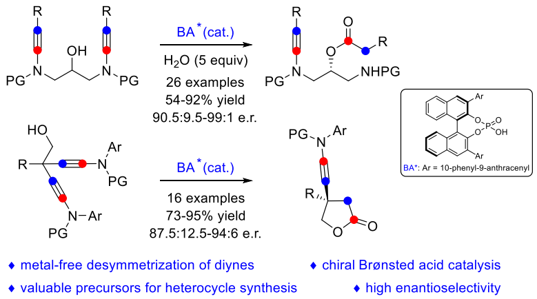 近些年来,通过活化炔酰胺来实现催化不对称官能团化反应一直受到科学家们的广泛关注。与发展成熟的过渡金属催化相比,基于炔酰胺的不对称有机催化发展相对较少。近日,公司钱鹏程教授课题组与厦门大学叶龙武教授课题组合作以简单易得的炔酰胺为底物,实现了手性Brønsted酸催化的去对称化反应。该反应具有如下特点:(1)首例手性Brønsted酸催化二炔的去对称化反应;(2)宽广的底物普适性(适用于1,4-和1,8-二炔);(3)优异的对映选择性。