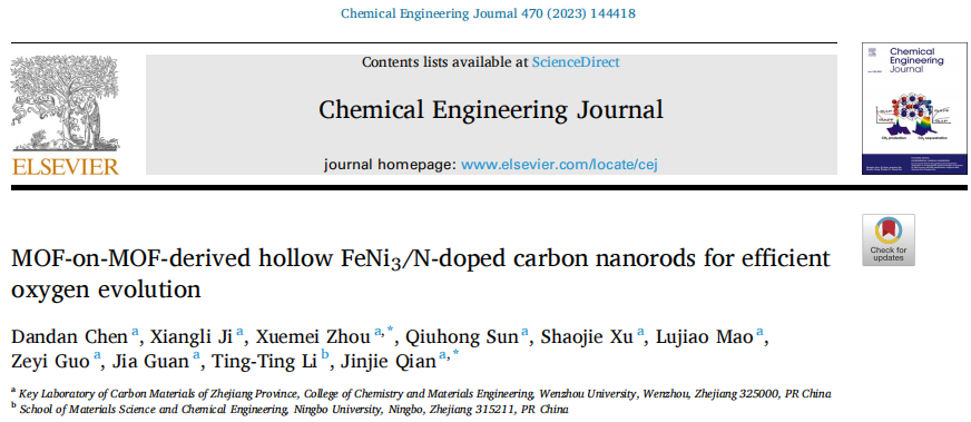 Dandan Chen, et al. MOF-on-MOF-Derived Hollow FeNi3/N-Doped Carbon Nanorods for Efficient Oxygen Evolution. Chem. Eng. J., 2023, 470, 144418.