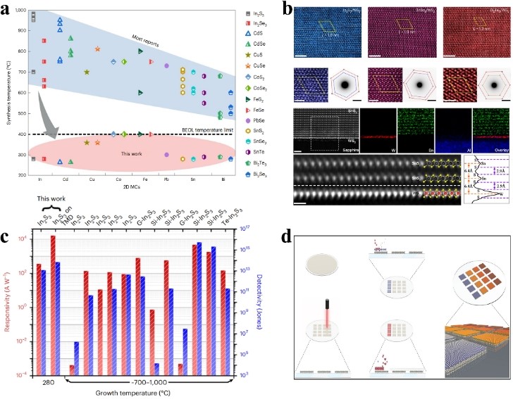 二维材料具有原子级的厚度、优异的电子传输及光电特性等新颖物理特性, 是发展高性能电子与光电子器件的理想载体,有望延续传统硅基半导体工业“摩尔定律”, 进一步提升芯片晶体管集成密度。然而,目前制备高质量的二维材料的工艺温度普遍较高(600-1000 ℃),远超过标准半导体 CMOS(互补型金属氧化物半导体)芯片制程工艺的温度限制(700/400 ℃分别对应于前/后道工艺), 这严重制约了二维材料与硅基集成电路的集成应用。虽然可以通过引入额外机械转移工艺实现二维材料的集成,但通过机械转移方法制备的样品不仅难以控制产物形貌尺寸,耗时低效,并且常在材料界面引入化学杂质,导致材料性能的明显衰退,难以规模化应用。因此,实现高质量二维材料的低温(<400 ℃)直接生长是推进其在半导体领域实际应用的理想解决方案。