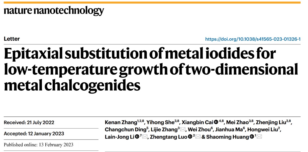 近日,公司张礼杰与广东工业大学黄少铭、香港大学李连忠、香港科技大学罗正汤等合作,针对二维材料及异质结与半导体芯片单片集成面临的温度限制难题,设计了一种普适性的范德华衬底协同二维碘化物低温原位替代生长方法,实现了 17 种高质量二维金属硫化物及其异质结的超低温可控生长(≤ 400℃)。结合理论计算,阐明了超低温原位替代生长机理,揭示了硫元素替换碘元素的低取代势垒微观本质,提出了碘化物硫(硒、碲)化的生长机理:替换反应优先发生在缺陷或边缘区域,之后的原子替代能垒大幅下降,发生了类似涟漪效应的连续 S-I 原子替换反应。并且在< 400℃下实现了多种二维材料及其异质结的大面积阵列集成,所制备的材料具有高的结晶质量和优异的光电性能。为二维材料与半导体芯片后端制造工艺的温度兼容性问题提供了一种可行性方案,并且为二维材料及其异质结的单片集成提供了一种新思路。该研究成果以“Epitaxial substitution of metal iodides for low-temperature growth of two-dimensional metal chalcogenides”为题目发表在在材料领域国际顶级学术期刊《Nature Nanotechnology》,云顶7610线路检测为共同通讯单位,公司张礼杰、香港大学Lain-Jong Li、香港科技大学罗正汤、广东工业大学黄少铭为共同通讯作者,公司教师赵梅为共同第一作者。