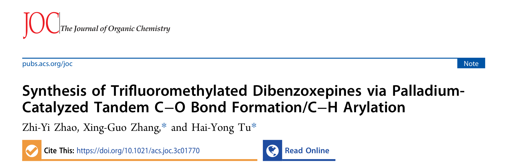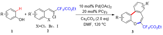 最近,公司张兴国教授、涂海勇副教授、硕士生赵治义发展了一种钯催化串联C-O键形成和C-H芳基化反应,为合成6-三氟甲基二苯并[b,d]氧杂䓬提供了一种简便高效的方案。相关成果以标题 “Synthesis of Trifluoromethylated Dibenzoxepines via Palladium Catalyzed Tandem C-O Bond Formation/C-H Arylation ” (DOI: org/10.1021/acs.joc.3c01770 ) 发表在The Journal of Organic Chemistry 上。在该工作中,作者以不同取代基的苯酚与2-氯-1-(邻卤代芳基)-3,3,3-三氟丙烯进行反应,得到了一系列的三氟甲基取代的二苯并氧杂䓬。作者以苯酚与1-溴-2-(2-氯-3,3,3-三氟丙-1-烯-1-基)苯为模板底物对反应条件进行了筛选。最终确定最优条件为:醋酸钯为催化剂,三环己基膦为配体,碳酸铯为碱,超干溶剂N,N-二甲基甲酰胺为溶剂,在氮气氛围中120oC反应24小时,产率达74%。