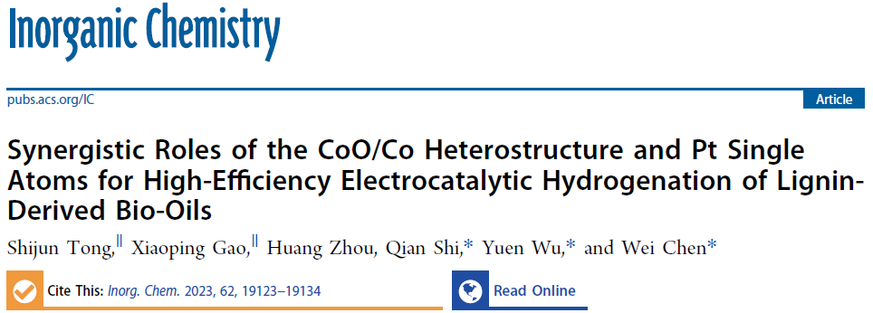 公司陈伟、时茜教授课题组和中国科学技术大学吴宇恩教授课题组在国际期刊《Inorganic chemistry》发表题为“Synergistic Roles of the CoO/Co Heterostructure and Pt Single Atoms for High-Efficiency Electrocatalytic Hydrogenation of Lignin-Derived Bio-Oils”的论文。该工作通过简单的电化学沉积的方法在CoO/Co异质结构上引入Pt单原子,通过单原子与载体之间独特的协同作用,优化了反应物、中间体和产物在催化活性中心上的吸附行为,从而显示出对苯酚ECH的高催化活性。一方面,由于自由电子从相邻的Co金属转移到Pt单原子位点附近,质子被还原并吸附在单原子Pt位点。另一方面,苯酚以平行构型吸附活化在CoO上。然后,单原子Pt周围的金属Co原子起到了关键的“桥梁”作用,将活化的H物种通过氢溢流转移到吸附的苯酚物种,最终生成KA油。
