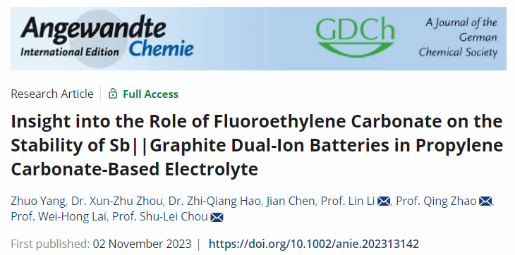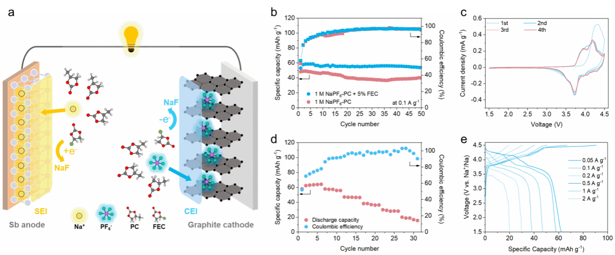 近日公司碳中和技术创新研究院李林团队联合南开大学赵庆教授以及澳大利亚伍仑贡大学赖伟鸿教授在国际权威期刊《Angewandte Chemie International Edition》上发表题为《Insight into the Role of Fluoroethylene Carbonate on the Stability of Sb||Graphite Dual-Ion Batteries in Propylene Carbonate-Based Electrolyte》的学术论文。本论文以锑(Sb)和石墨分别作为阳极和阴极,研究了含有氟代碳酸乙烯酯(FEC)添加剂的电解液中Na- DIBs的电化学性能。与不含FEC的电解液(1 M NaPF6-碳酸丙烯酯(PC))相比,作者发现加入FEC添加剂(5 wt.%)可促进阴极和阳极上富含NaF的无机电极电解质界面的形成,并改变PF6-阴离子的溶剂化行为。这种改性不仅有效抑制了NaPF6盐和PC溶剂的过度分解,还促进了PF6-阴离子在石墨阴极中的插层。制备的Sb||石墨全电池在50次循环后达到了58.5 mAh g-1的高放电比容量,容量保留率为93.1%(而传统电解质分别为48.3 mAh g-1和79.7%)。此外,在功率密度为157.78 W kg-1时,电池的能量密度为194.95 Wh kg-1(基于正极和负极的活性材料的质量)。本工作阐明了双功能FEC的潜在机制,并为构建高性能双离子电池提供了一种替代策略,促进了他们在未来可持续储能系统中的实际应用。