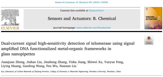 本工作以“Dual-current signal high-sensitivity detection of telomerase using signal amplified DNA functionalized metal-organic frameworks in glass nanopipettes”为题发表在国际知名期刊《Sensors and Actuators B: Chemical》上。云顶7610线路检测为第一通讯单位,公司2021级研究生郑娟娟为第一作者,公司刘楠楠特聘教授为通讯作者。本研究工作得到国家自然科学基金的资助(21505101))以及感谢云顶7610线路检测何华成老师提供的细胞帮助。