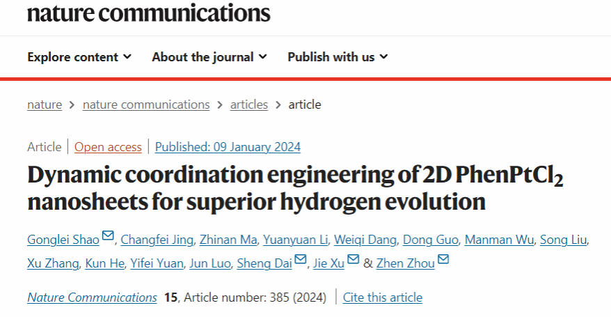 该研究以“Dynamic coordination engineering of 2D PhenPtCl2 nanosheets for superior hydrogen evolution”为题发表在Nature子刊《Nature Communications》,公司何坤、袁一斐、许杰为本文作者,周震教授、许杰特聘教授、戴升教授及邵功磊研究员为本文共同通讯作者,相关工作受到国家自然科学基金等资助。