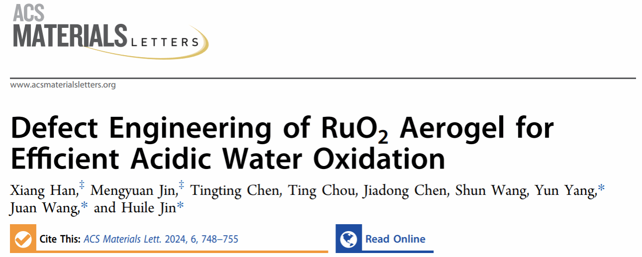 相关论文以“Defect Engineering of RuO2 Aerogel for Efficient Acidic Water Oxidation”为题发表在ACS Materials Letters上。云顶7610线路检测为第一通讯单位,公司本科生韩翔为第一作者,公司金辉乐研究员、王娟副教授和杨云研究员为通讯作者,相关工作受到国家自然科学基金项目的资助。