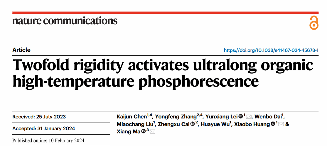 近日公司黄小波教授/雷云祥特聘教授联合华东理工大学马骧教授在国际顶级期刊《Nature communications》上发表题为《Twofold Rigidity Activates Ultralong Organic High-Temperature Phosphorescence 》的学术论文。该工作选择具有几乎完全平面结构的刚性分子9H-二苯并[a,c]咔唑(BCZ)作为客体分子,平面结构可以使分子的振动和旋转最小化。此外,刚性结构有利于增加磷光寿命,延长余辉时间。选择具有刚性结构和高玻璃化转变温度的聚乙烯吡咯烷酮(PVP)作为主体基质,进一步抑制客体的分子运动。这种双重刚性导致掺杂材料BCZ/PVP在293 K下表现出40 s的超长余辉,在373 K下表现出长达20 s的强余辉,在413 K下表现出约6 s的明亮余辉,甚至在433 K下表现出1 s的清晰余辉,表现出优异的HTP性能。此外,将旋转能力从弱到强的甲基、正丁基、苄基、苯基和三苯胺基进一步连接到BCZ分子上,制备了5个对照客体(BCZ-Me、BCZ-nBu、BCZ-Be、BCZ-Ph和BCZ-TPA)。烷基(如甲基或正丁基)对分子激发态能的影响相对较小,因此BCZ-Me/PVP和BCZ-nBu /PVP掺杂材料表现出与BCZ/PVP几乎相同的HTP性能。从BCZ-Be到BCZ-TPA,随着基团旋转能力的增加,相应掺杂材料的HTP性能逐渐下降,符合逻辑和预期的趋势。实验结果和理论计算表明,刚性平面结构可以抵抗高温下的分子热运动。此外,主体基质在高温下提供的刚性环境是影响材料HTP性能的重要因素。进一步选择聚乙烯醇(PVA)和聚己二酰己二胺(PA66)作为主体基质。虽然所有掺杂材料均表现出优异的RTP性能,但由于PVA和PA66的玻璃化转变温度值低于PVP,以PVA或PA66为主体的掺杂材料的HTP性能弱于以PVP为主体的掺杂材料。最后,以其他四种平面分子为客体的掺杂材料也表现出优异的HTP性能,表明双刚性策略具有良好的通用性。本研究提出了构建HTP材料的策略,将促进有机磷光材料的发展。