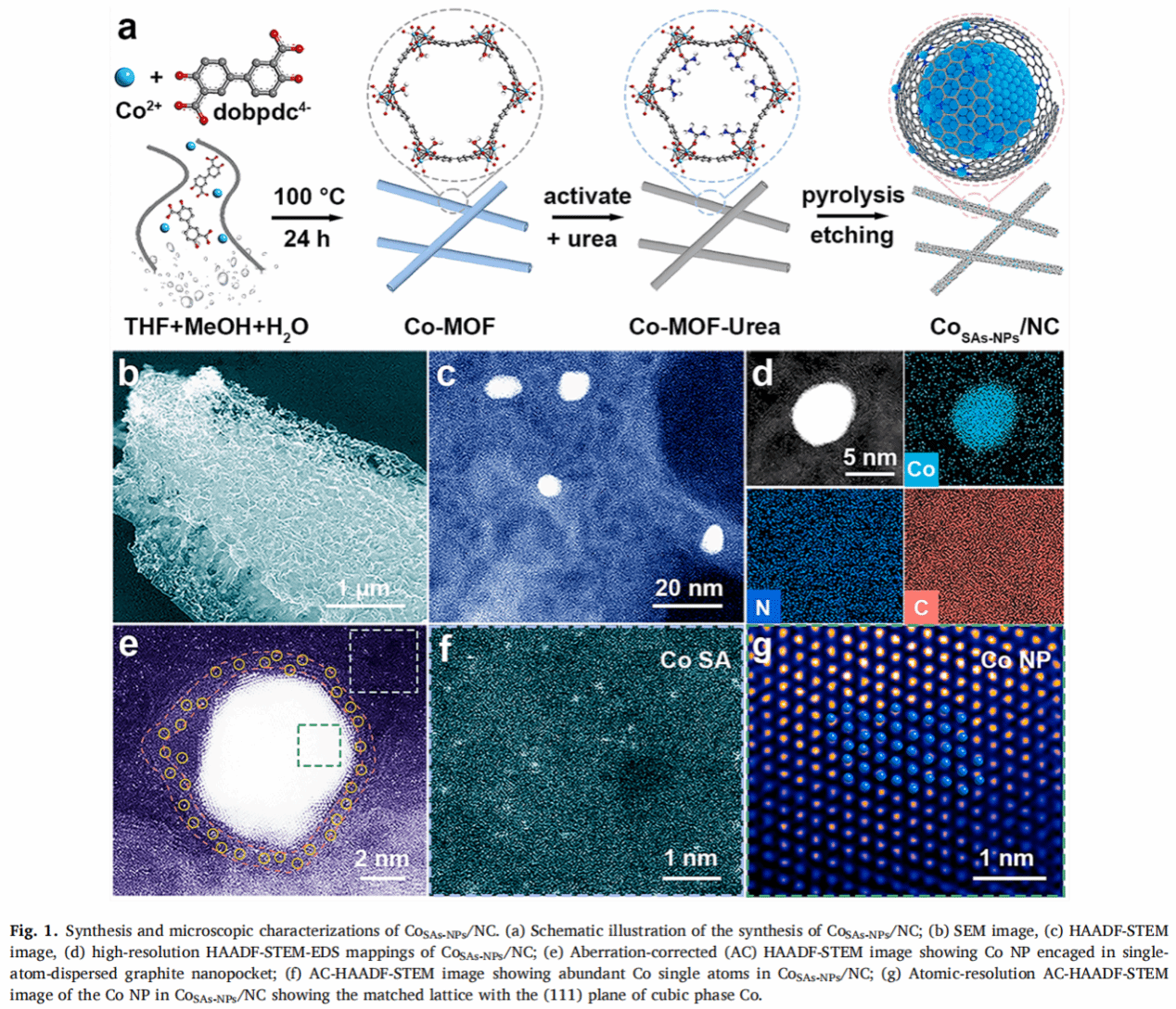 近日,云顶7610线路检测钱金杰课题组通过逐步合成策略,对Co-MOF的内部Co金属位点配位环境调控,成功实现了客体尿素分子(urea)的配位掺杂(Co-MOF-Urea)。随后,我们将其热解碳化,再经酸刻蚀处理,最终获得了一种将Co纳米颗粒(Co NPs)嵌入在Co‒N4原子分散(Co SAs)的石墨“纳米口袋”氧还原催化剂(CoNPs-SAs/NC, Figure 1)。基于该特殊的构效关系,所制备的氧还原催化剂不仅能充分发挥Co纳米颗粒与Co单原子之间的协同催化作用,而且表现出优异的催化活性和稳定性。同时,在实际的二次柔性锌空电池中,该催化剂展现出了卓越的电池性能。本研究为合理设计和制备基于MOF衍生的碳纳米材料电催化剂提供有效的新思路。