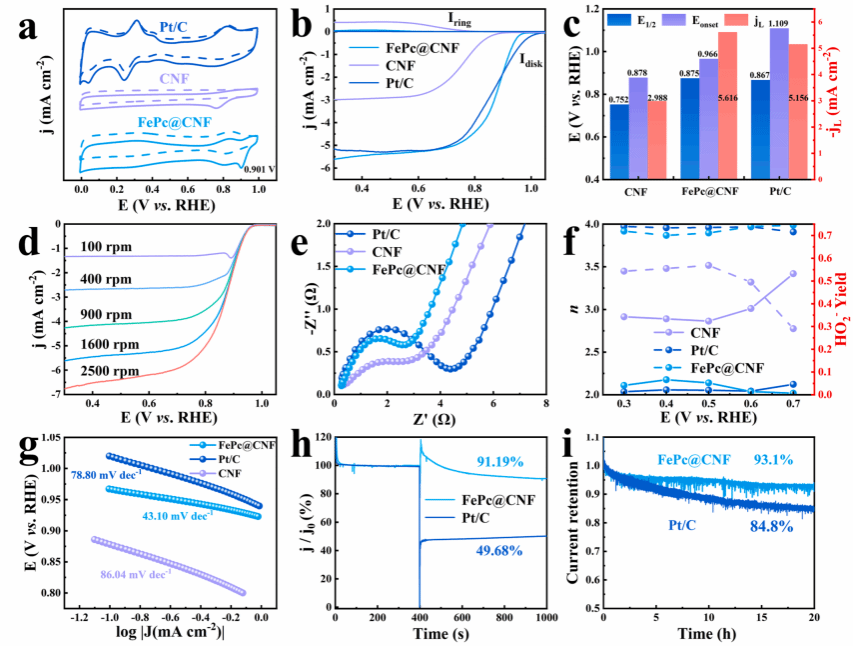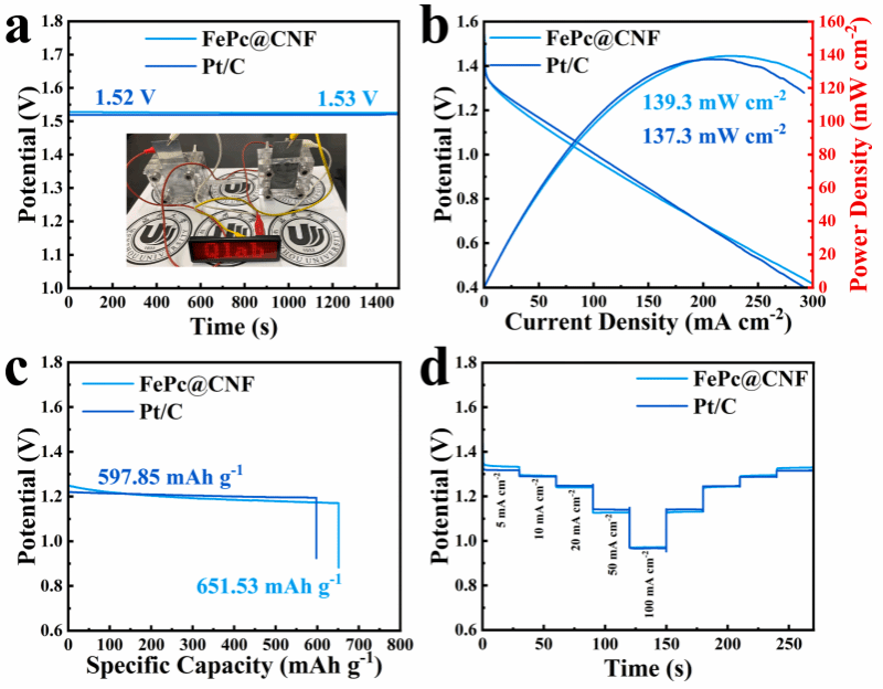 FePc@CNF催化剂表现出显著的ORR性能,其起始电位为0.966 V,半波电位E1/2为0.875 V,极限电流密度jL值为5.616 mA cm-2(Figure 1)。为了验证其在实际应用中的性能,组装的ZAB在OCV下具有1.53 V的值,功率密度为139.3 mW cm-2(Figure 2),均与商业Pt/C相当。