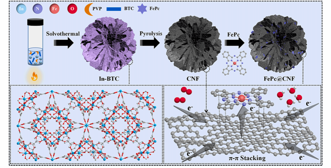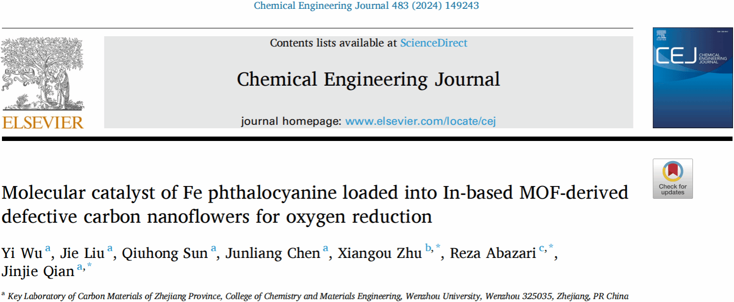 Yi Wu, Jie Liu, Qiuhong Sun, Junliang Chen, Xiangou Zhu*, Reza Abazari* and Jinjie Qian*. Molecular catalyst of Fe phthalocyanine loaded into In-based MOF-derived defective carbon nanoflowers for oxygen reduction. Chemical Engineering Journal, 2024, 483, 149243.