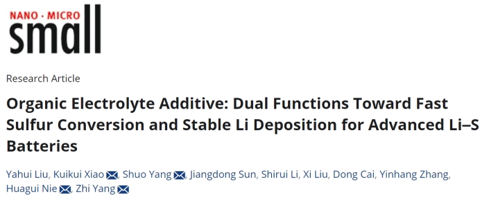 该研究以“Organic Electrolyte Additive: Dual Functions toward Fast Sulfur Conversion and Stable Li Deposition for Advanced Li–S Batteries”为题发表在国际顶级学术期刊《Small》。云顶7610线路检测为唯一通讯单位,公司肖逵逵博士,杨硕副教授,聂华贵教授和杨植教授为共同通讯作者,21级硕士研究生刘雅慧为第一作者,相关工作受到国家自然科学基金(22309135、22109119、51972238、U21A2081)、浙江省自然科学基金(LQ22B030003)、温州市重大科技创新项目(ZG2021013)等项目的资助。