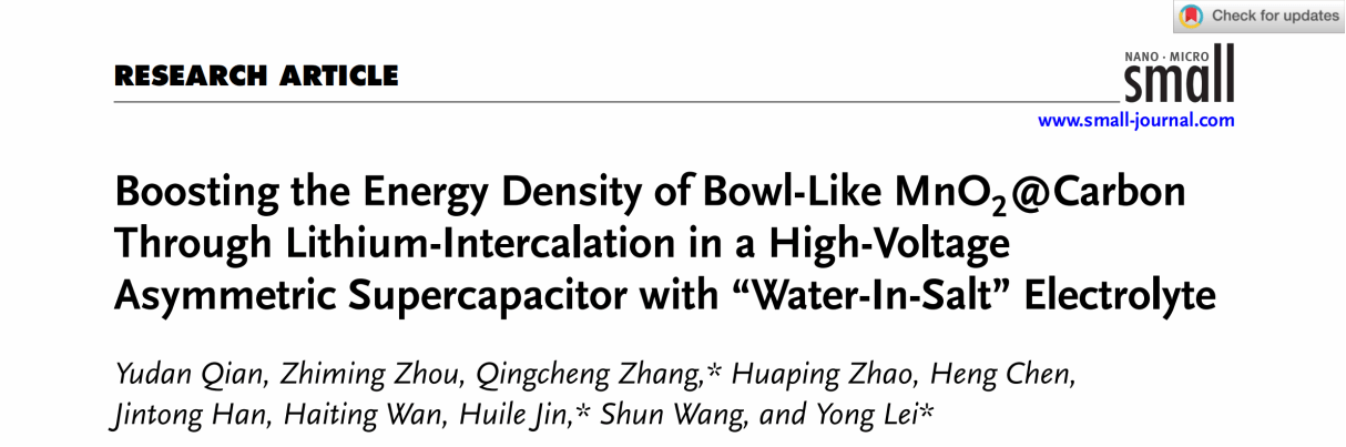 这一研究结果以“Boosting the Energy Density of Bowl-Like MnO2@Carbon Through Lithium-Intercalation in a High-Voltage Asymmetric Supercapacitor with “Water-In-Salt” Electrolyte”为题发表在国际权威期刊《Small》(IF=13.3),云顶7610线路检测作为第一通讯单位,云顶7610线路检测2020级研究生钱宇丹和2019级研究生周志明为文章的共同第一作者,公司张青程副教授,金辉乐教授和德国伊尔梅瑙工业大学雷勇教授为本文的共同通讯作者。该工作受到国家自然科学基金项目(21706196)、浙江省自然科学基金项目(LZ20E010001)和浙江省教育厅科研项目(Y202146711)的支持。