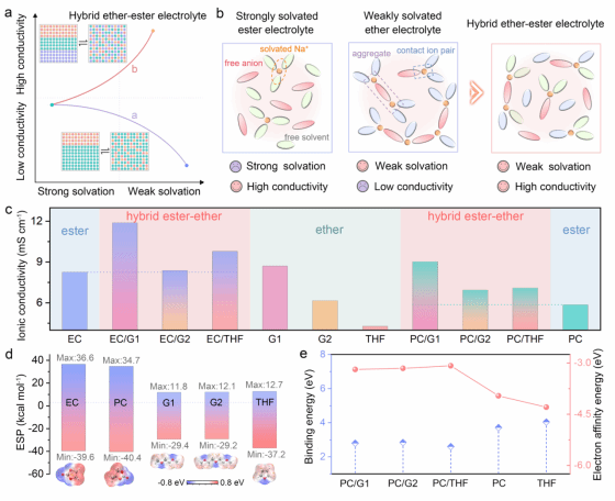 图1. 电解液设计。(a) 弱溶剂化电解液和混合酯醚电解液示意图; (b) 三种电解液的溶剂化结构示意图和优势;(c) 1.0 M NaPF6基电解液的离子电导率;(d) EC、PC、G1、G2和THF溶剂的静电势密度;(e) Na+-PC/G1、Na+-PC/G2、Na+-PC/THF、Na+-PC和Na+-THF簇的结合能和电子亲和能。