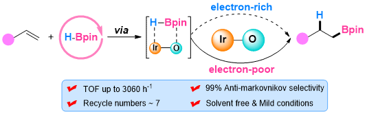 其次,他们创新性地提出了一种通过控制Ir SA催化剂中Ir-O配位键的电子构型来显著提高烯烃硼氢化反应的有效的策略。通过Ni2+空位缺陷的稳定作用,在形貌和尺寸相近的Ni(OH)x和NiOx载体上构建了两种具有Ir-O配位键的Ir SA催化剂。一系列表征证明了Ir1/Ni(OH)x中的Ir-O配位键与Ir1/NiOx相比具有更低的电子密度,因此其氧化性更强。研究发现,在无溶剂条件下的烯烃反马氏硼氢化反应中,具有贫电子特性的Ir-O配位键使得Ir1/Ni(OH)x能够在温和的条件(环境温度、Air、20 min)达到3060 h-1的优异转化频率(TOF)值,是Ir1/NiOx的72倍,远远优于传统的多相Ir纳米催化剂和均相Ir催化剂。结合机理研究和化学计算分析进一步揭示了Ir1/Ni(OH)x优异的活性源于其中存在的贫电子Ir-O配位键的强氧化作用,可使H-B(OR)2的B-H键更有效地断裂,从而使烯烃的硼氢化反应以更低的能垒顺利进行。这项工作将为改变SA催化剂中配位键的性质以优化其性能提供新的线索,并为开发出性能更好的异相催化剂以用于均相有机反应的异相化提供思路。此项工作以《Electron Deficient Ir-O Bonds Promote Heterogeneous Ir-Catalyzed Anti-Markovnikov Hydroboration of Alkenes under Mild Neat Conditions》为题发表在《Nano Letters》上,云顶7610线路检测为第一通讯单位,公司2021级硕士研究生张莎莎与哈尔滨工程大学的赵旭东博士为论文共同第一作者,公司张剑特聘教授与哈尔滨工程大学的刘志亮教授与为论文共同通讯作者。(文章链接:https://doi.org/10.1021/acs.nanolett.4c00163)