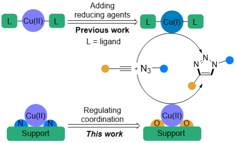 最后,张剑课题组还开发出一种新的合成策略,通过构建具有N和O配位的SA Cu (II)催化剂可以在没有还原剂的情况下顺利实现直接叠氮化物-炔烃点击化学。以密度泛函理论( DFT )计算分析不同Cu (II)中心上Cu-炔中间体的形成难易为指导,通过有机分子辅助法在碳包覆的Al2O3上合成了具有O和N配位的SA Cu (II)催化剂。尽管Cu的氧化态都接近+2,但O配位的SA Cu (II)催化剂对叠氮-炔烃环加成的活性比N配位的高5倍,同时具有良好的可回收性和底物适应性。进一步的EPR探究证明了炔烃底物更容易还原O配位而非N配位的SA Cu(II)中心,这与DFT计算得出的结论一致,也解释了点击反应活性提高的原因。这项工作拓展了固载化Cu (Ⅱ)催化体系在点击化学中的应用,为克服非均相催化的障碍,开发性能更好的非均相催化体系提供了新的指导。此项工作以《Oxygen Coordination Promotes Single-Atom Cu(II)-Catalyzed Azid−Alkyne Click Chemistry without Reducing Agents》为题近期发表在《ACS Applied Materials & Interfaces》上,云顶7610线路检测为第一通讯单位,公司2022级硕士研究生于婷婷与与中国科公司物理研究所的Tao Lei为论文共同第一作者,公司张剑特聘教授与安徽大学的柳守杰教授和华北电力大学的叶陈良教授为共同通讯作者。(文章链接:https://doi.org/10.1021/acsami.4c00280)