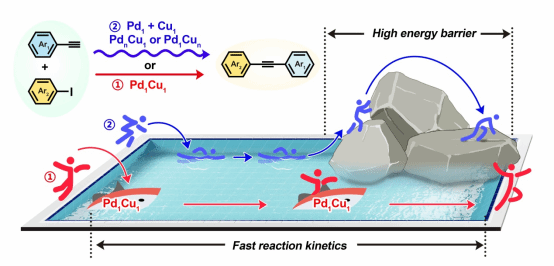 首先,他们开发出了一种简便的蛋白质包覆策略,利用牛血清白蛋白中分布均匀的丰富的氨基和羧基,使得Cu和Pd前驱体在适当的距离上均匀分散,热解后形成的碳材料中掺杂的N和O为Cu和Pd原子提供锚定位点,在棒状氧化铝上成功制备了处于拥挤状态的Pd和Cu单原子。该制备方法操作简单,对于金属前驱体和载体材料没有特殊要求。所制得的催化剂在Sonogashira 偶联反应中表现出优异的活性,其TOF值为313 h-1,显著高于常规“半均相”催化剂Pd/C和CuI、含Pd和Cu纳米颗粒的多相催化剂以及Pd和Cu单原子混合催化剂。此外,它还在回收测试中表现出良好的催化稳定性。理论研究证明带正电荷的Pd和Cu单原子中心在芳基卤化物和炔烃的活化中具有显著的优势,且它们之前的空间距离较近,明显有利于形成的乙炔基中间体的金属化过程,从而大大提高了Pd1Cu1/NOC/Al2O3在Sonogashira 偶联反应中的催化活性。这项工作不仅为高效构建具有多个相邻活性中心的高性能非均相催化剂提供了重要线索,而且为实现多个活性中心共同催化的高效有价值的有机转化提供了新的指导。此项工作以《Constructing Pd and Cu Crowding Single Atoms by Protein Confinement to Promote Sonogashira Reaction》为题近期发表在 《Adavanced Meterials》上,云顶7610线路检测为第一通讯单位,公司2022届本科毕业生赵琴英、公司2022级硕士研究生刘之逸与哈尔滨工程大学2021级博士生赵旭东为论文共同第一作者,公司张剑特聘教授与哈尔滨工程大学刘志亮教授为共同通讯作者。(文章链接:https://onlinelibrary.wiley.com/doi/10.1002/adma.202402971)